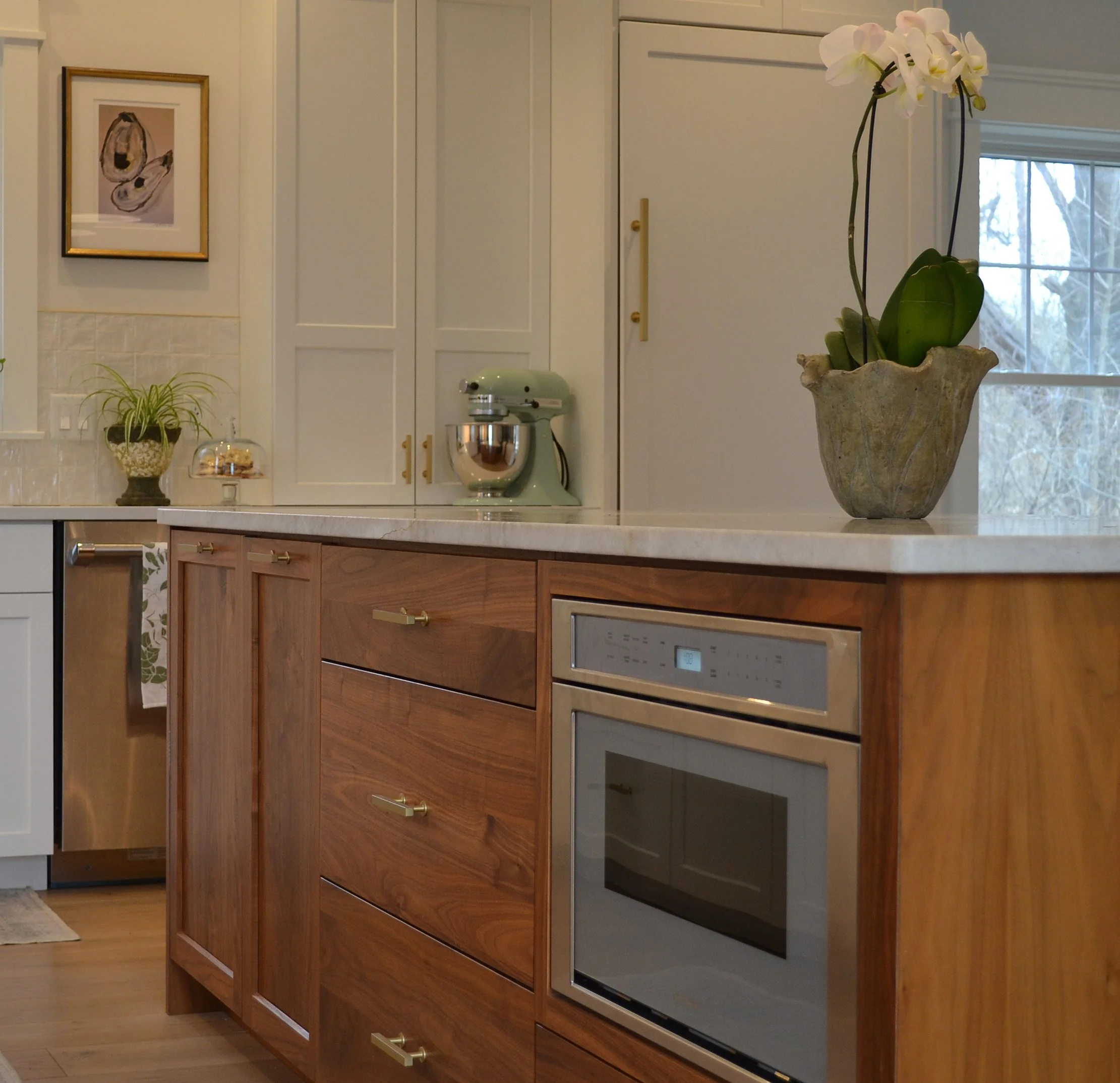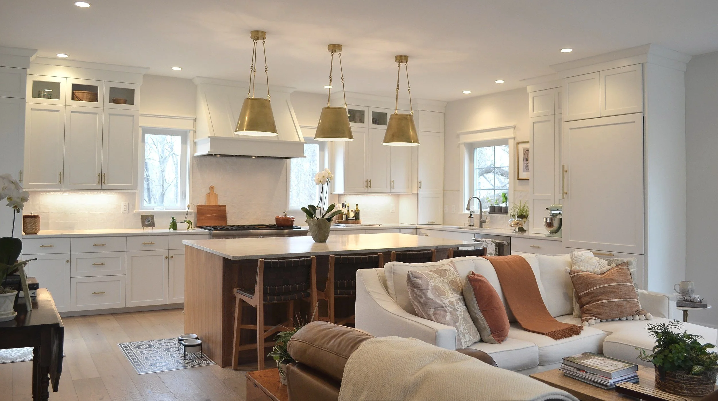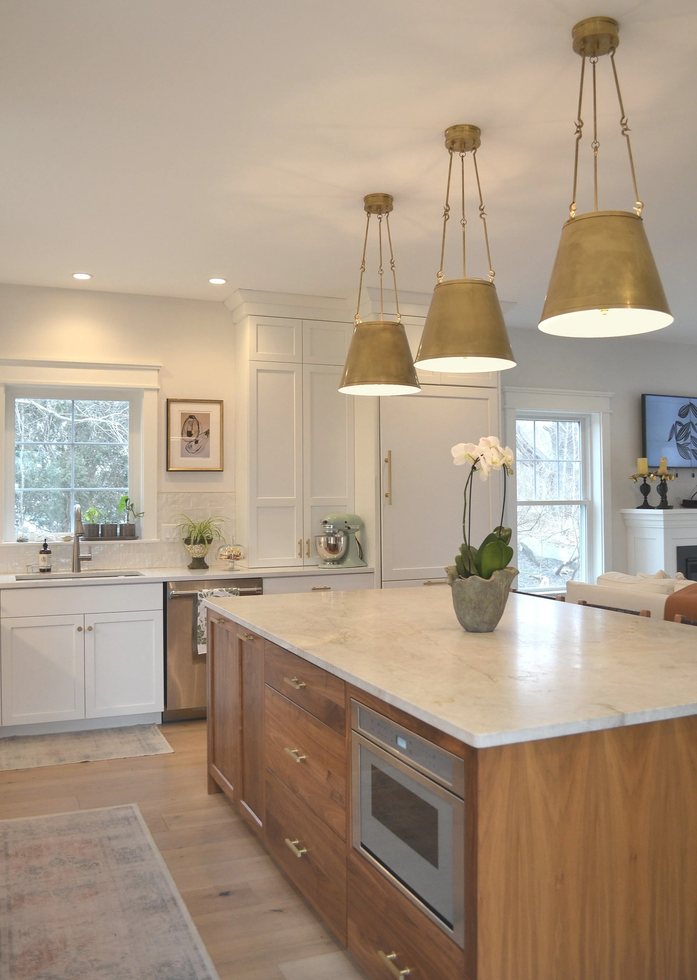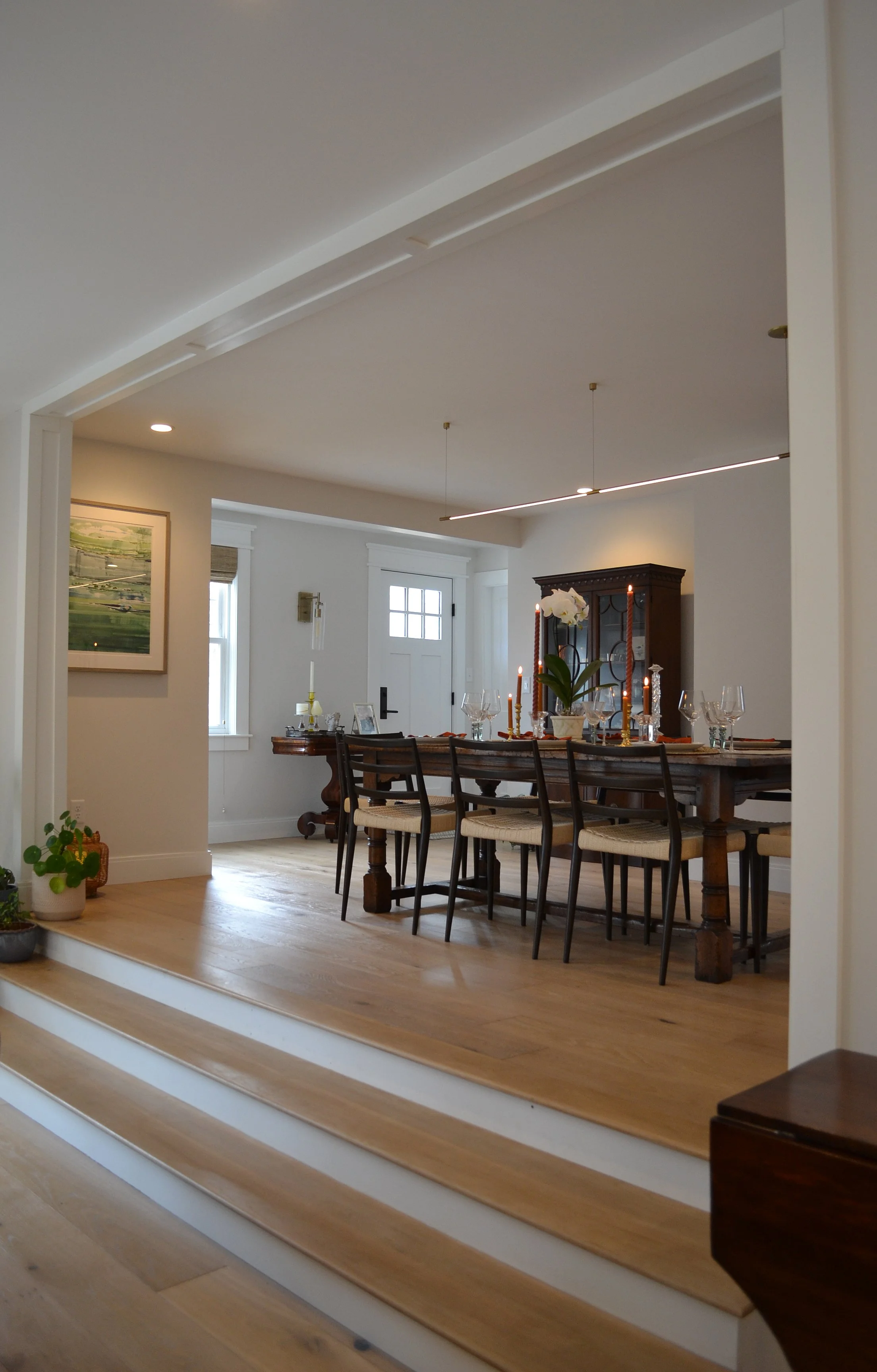 Elizabeth provided an initial plan for connecting the existing house to a gracious new addition. Working closely with the homeowners, we thoughtfully planned a new living and kitchen space while rethinking the purpose of rooms in the existing home. The result is a spacious, open plan that is perfect for family gatherings and entertaining. We also provided consultations on the kitchen cabinetry layout, and finishes and personally selected the lighting, countertops, backsplash, and hardware. In the dining space, Elizabeth and the homeowners shopped vintage for the perfect dining room table, paired them with new dining chairs and incorporated the client’s own antique furniture for a layered and personal finished room.